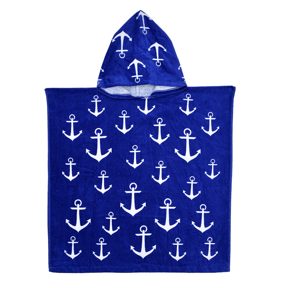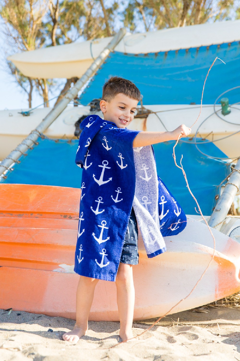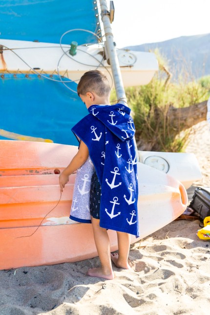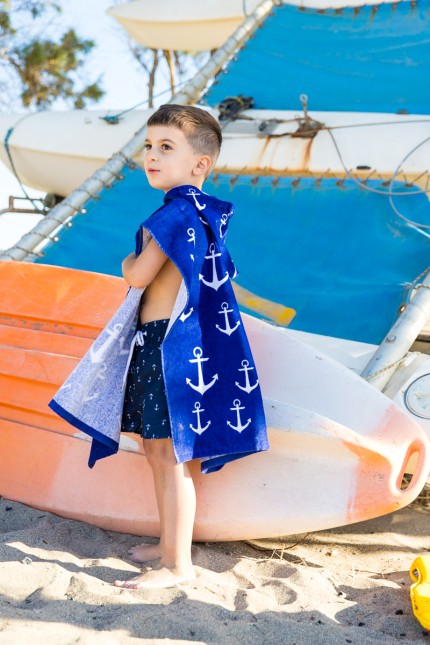 Παιδικό μπουρνούζι με άγκυρες και κουκούλα. Μια επιλογή κατάλληλη για θάλασσα, παραλία ή και για το μπάνιο. Είναι έξτρα απορροφητικό και στεγνώνει γρήγορα.