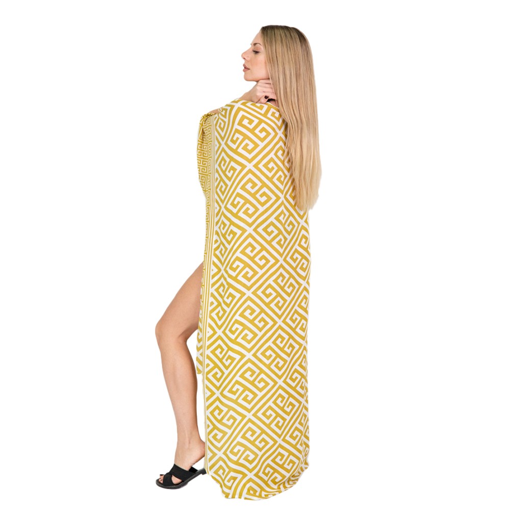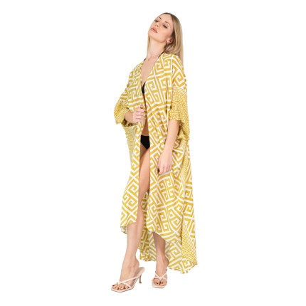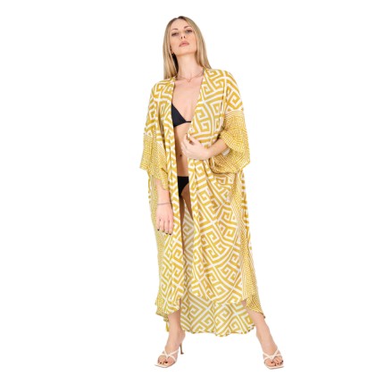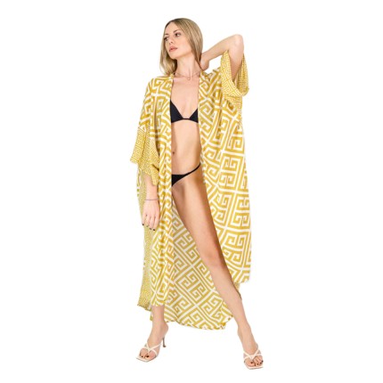 Μάξι φόρεμα κιμονό με σχέδιο μαίανδρος. Άνετη εφαρμογή και δροσερό, ιδανικό για τις καλοκαιρινές εξορμήσεις σας. Εφαρμόζει όμορφα σε όλους τους τύπους σώματος.