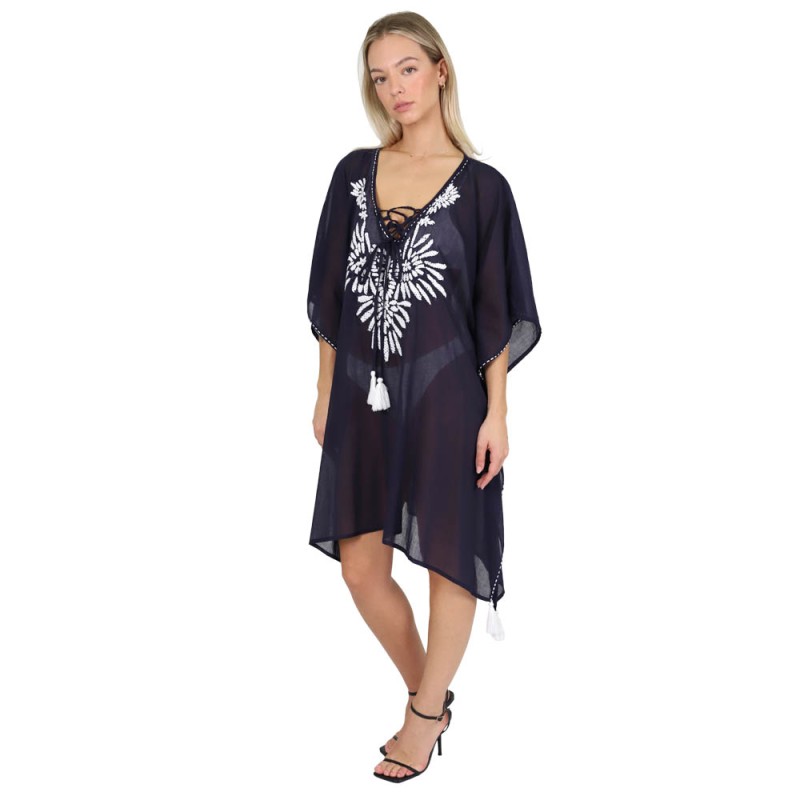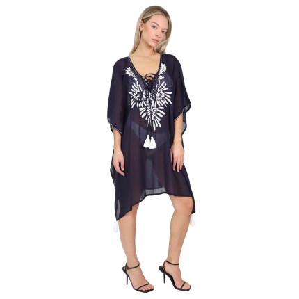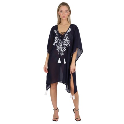 Καφτάνι-πουκαμίσα με κεντημένες λεπτομέρειες ματάκια και παγιέτες. Αέρινο και άνετο, ενώ παράλληλα στιλάτο και κομψό. Μπορεί να φορεθεί όλες τις ώρες της ημέρας. Συνδυάζεται εύκολα με όλα τα μαγιό ενώ παράλληλα εφαρμόζει όμορφα σε όλους τους τύπους σώματος.