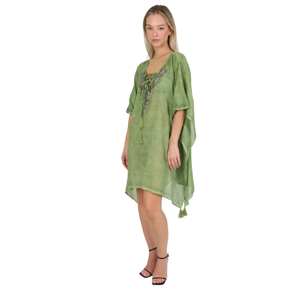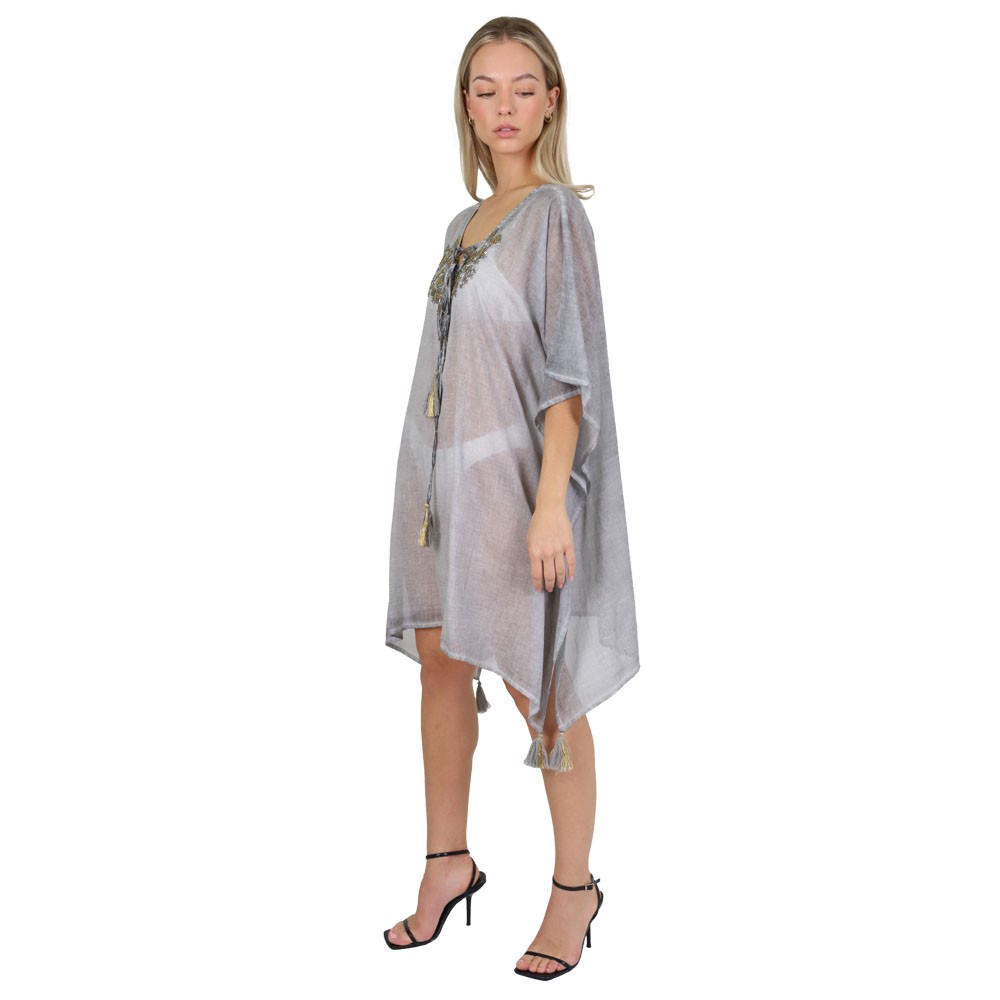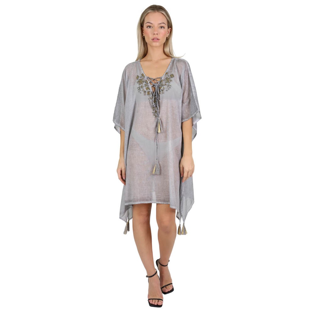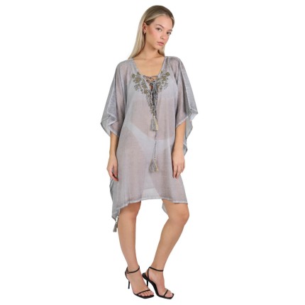 Καφτάνι-πουκαμίσα με κεντημένες λεπτομέρειες . Αέρινο και άνετο, ενώ παράλληλα στιλάτο και κομψό. Μπορεί να φορεθεί όλες τις ώρες της ημέρας. Συνδυάζεται εύκολα με όλα τα μαγιό ενώ παράλληλα εφαρμόζει όμορφα σε όλους τους τύπους σώματος.