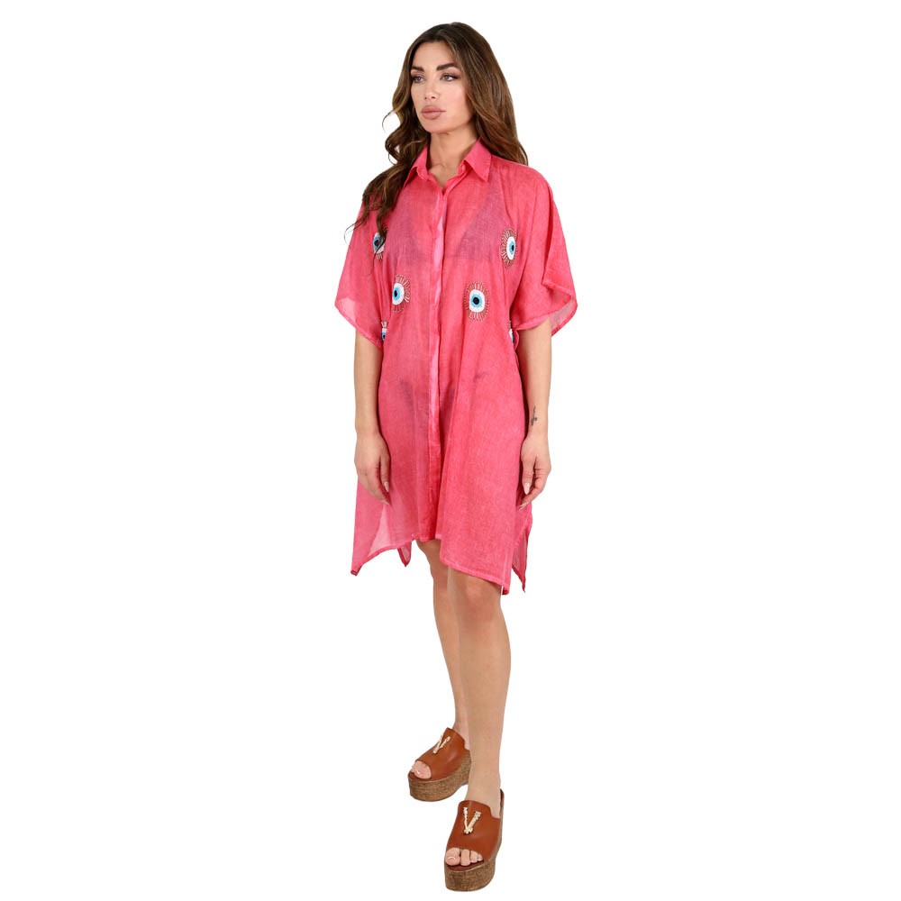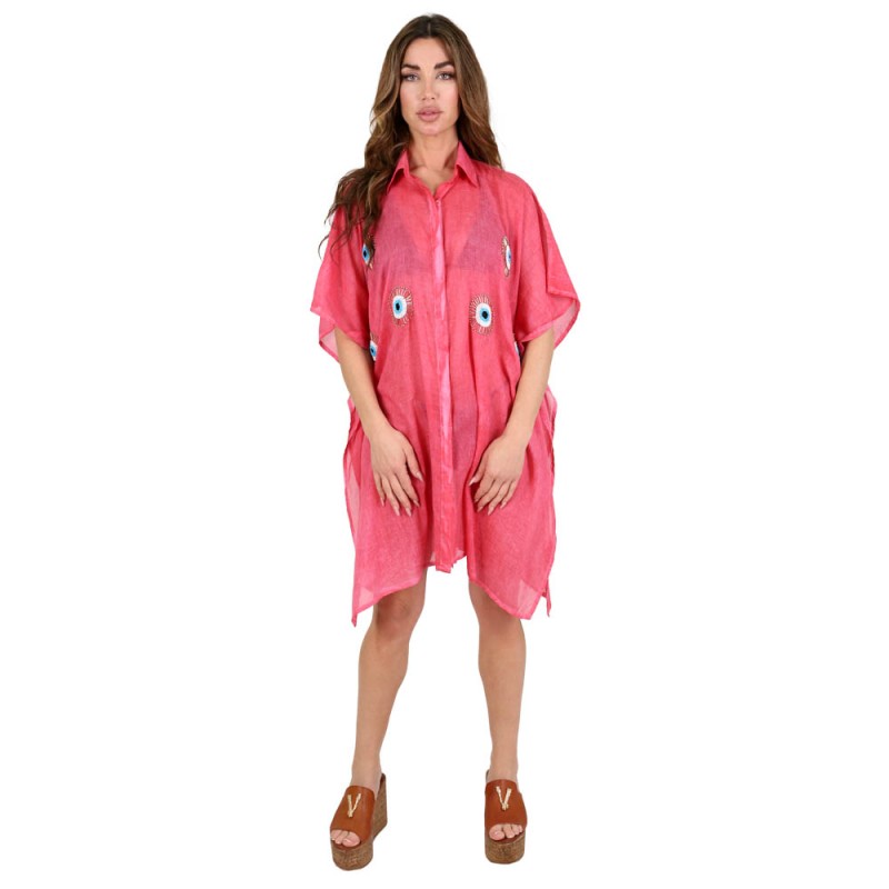 Καφτάνι-πουκαμίσα με κεντημένες λεπτομέρειες ματάκια και παγιέτες. Αέρινο και άνετο, ενώ παράλληλα στιλάτο και κομψό. Μπορεί να φορεθεί όλες τις ώρες της ημέρας. Συνδυάζεται εύκολα με όλα τα μαγιό ενώ παράλληλα εφαρμόζει όμορφα σε όλους τους τύπους σώματος.