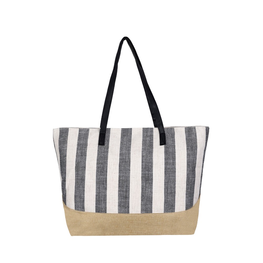 Τσάντα θαλάσσης, ψάθινη με δερματίνη σε σχέδιο με ρίγες. Περιέχει 3 εσωτερικές θήκες, εσωτερική φόδρα και ασφαλίζει με φερμουάρ. Μια επιλογή που θα ταιριάξει με όλες σας της εμφανίσεις.