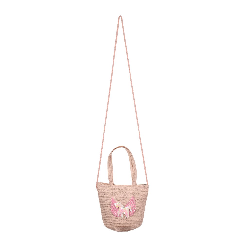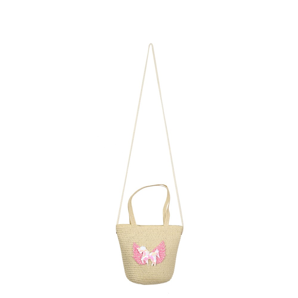 Παιδικό Τσαντάκι ώμου, ψάθινο Μονόκερος σε 4 απαλές αποχρώσεις. Περιέχει 2 εσωτερικές θήκες, εσωτερική φόδρα και ασφαλίζει με φερμουάρ. Μια επιλογή που θα ταιριάξει με όλες σας τις εμφανίσεις.