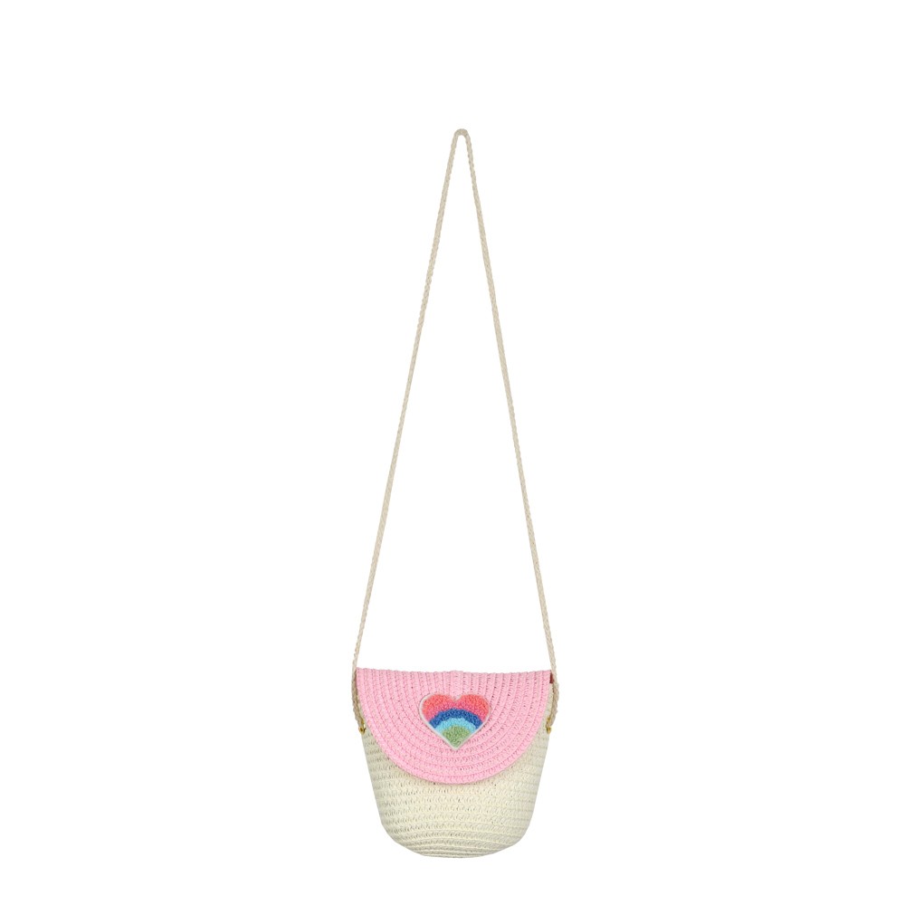 Παιδικό Τσαντάκι ώμου, ψάθινο Καρδιά σε 2 απαλές αποχρώσεις. Περιέχει 2 εσωτερικές θήκες, εσωτερική φόδρα και ασφαλίζει με φερμουάρ. Μια επιλογή που θα ταιριάξει με όλες σας τις εμφανίσεις.