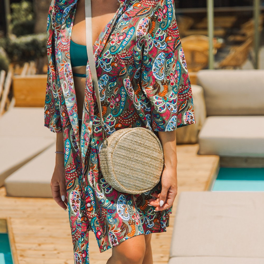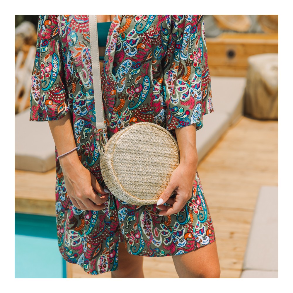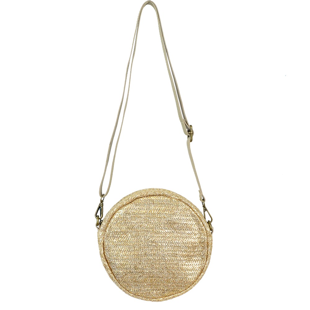 Round straw bag with adjustable strap for perfect fit. Contains inner lining, two inner pockets and zippers. A choice that will match with all your outfits.