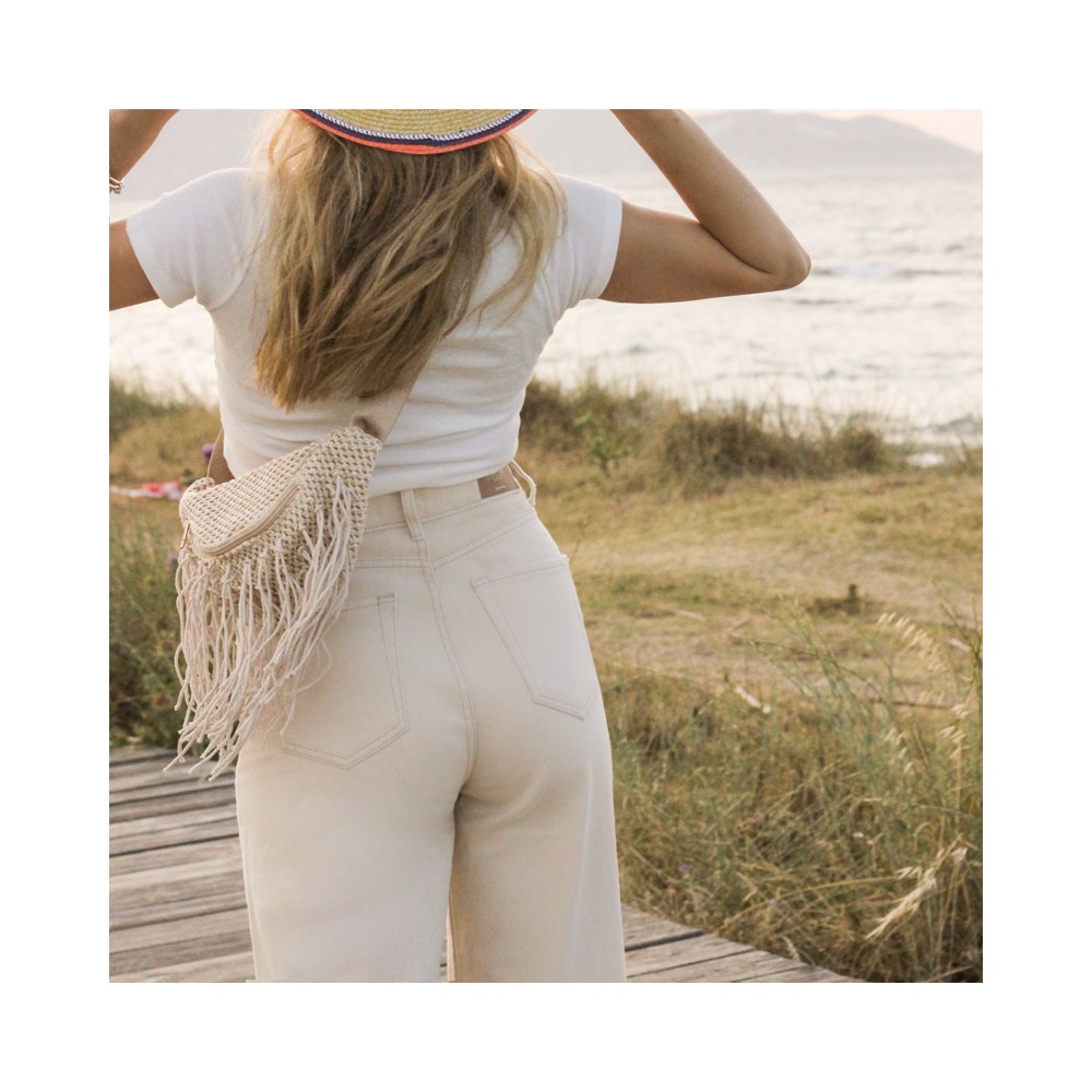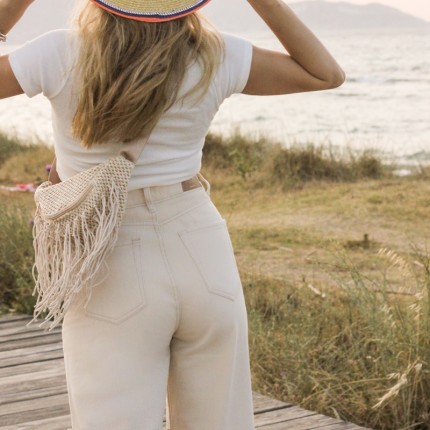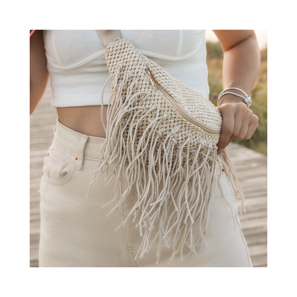 Straw waist bag with adjustable  strap for perfect fit. Contains inner lining, one inner pocket and secures with zipper. A choice that will match with all your outfits.