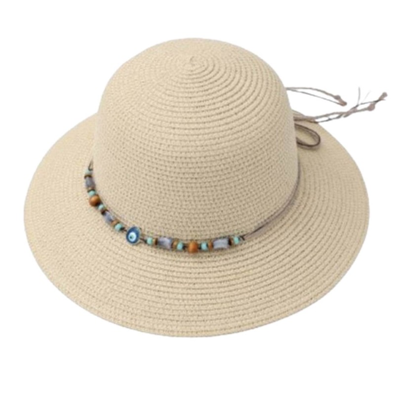 Straw Hat with decorative beads around the band. It is easily combined, in walks with everyday clothes but also in casual situations.